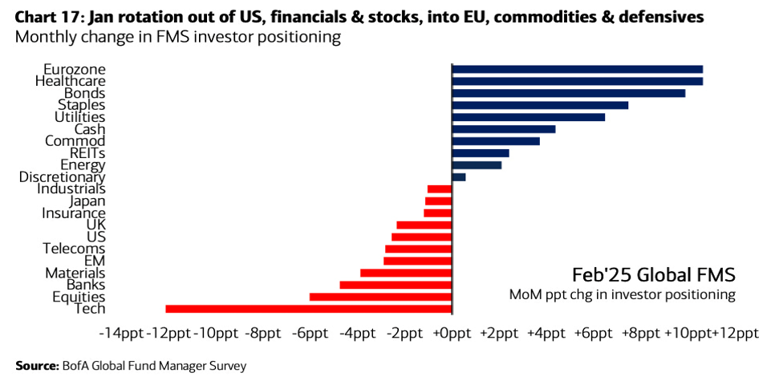 This follows a dramatic mood swing from the end of last year. February’s Bank of America’s global fund manager survey showed investor positions in Eurozone equities rising to a net 12% overweight versus a net 25% underweight in December. US equity exposure has meanwhile fallen to a net 17% overweight from its 36% peak at year-end. According to EPFR, the third week of February saw the largest inflows into European equity funds since early 2022.