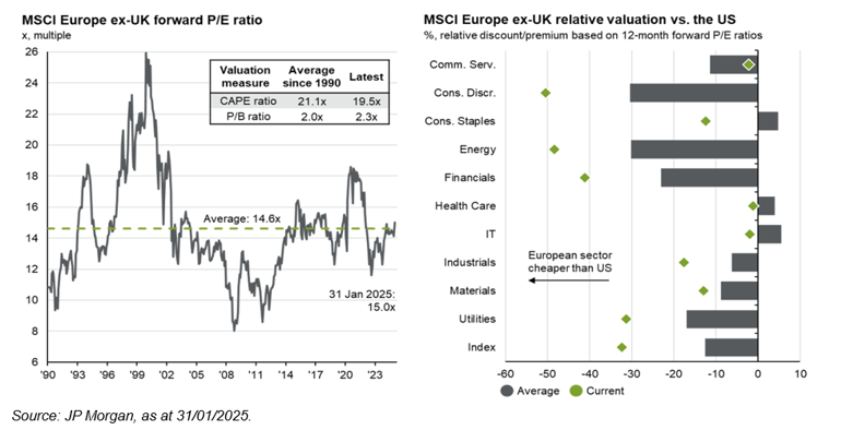 Several factors are driving Europe’s revival. There has been relief that Donald Trump decided against an immediate introduction of tariffs on EU imports, despite his pre-election threats and perceptions that European companies posed a significant threat to his ‘America First’ policies. This has boosted economic growth prospects in Europe and prompted analysts to raise earnings estimates by 0.6% since the start of year, versus a 1.0% downgrade for US companies according to Bloomberg.