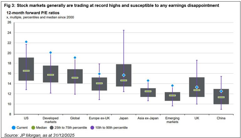 The market rally also means that valuations are now at record levels across both developed and emerging markets (see figure 3) and although multiples may be supported by expectations for double-digit earnings growth across most regions in 2026, the market looks vulnerable to any disappointment, particularly from the MAG 7 which now represent over a third (34%) of the US market and a fifth (22%) of the global index[4].