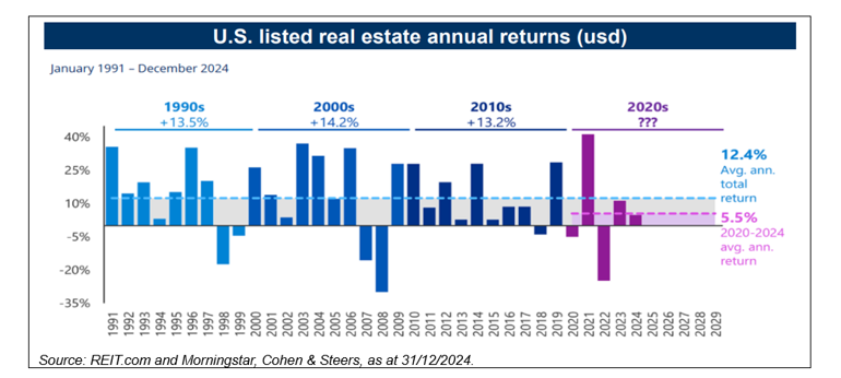 The longer-term performance of US REITs is similarly compelling over the same timeframe with annualised returns averaging ~12% across different macro and market cycles until recently (see chart). The headwinds of COVID and a subsequently higher inflation and interest rate environment have seen this fall to ~6% since 2020, suggesting the possibility for mean reversion over the next few years as macro conditions normalise and become more favourable.