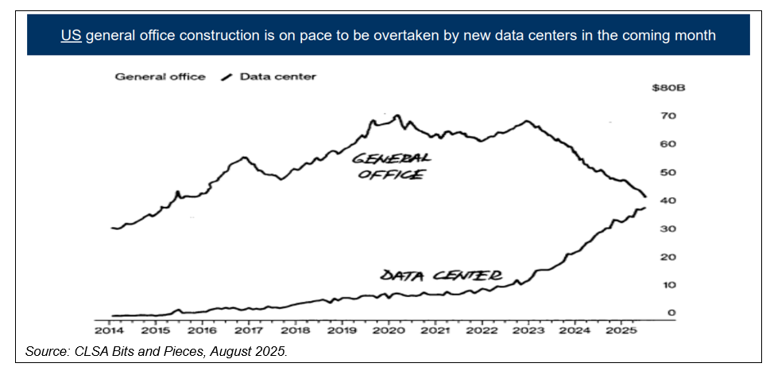 SKAGEN m2 currently has around 5% of assets exposed to office-related companies, while almost a fifth (19%) of the fund is invested in digital real estate such as data centres and towers. The rapid growth of data centres in recent years, largely to meet the needs of big tech companies and AI, means that their construction is on track to overtake that of general offices in the US over the next few months. From an investment perspective, the segment is highly attractive as demand is expected to outstrip supply for years to come, driving strong rental growth, as data usage increased globally and across sectors outside of technology.
