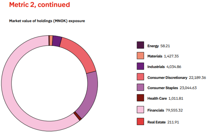 This metric assesses the level of exposure of our portfolio to companies potentially linked to deforestation. Forest IQ places companies in different exposure categories, by estimating volume of commodities sourced or produced with risk of deforestation. (Financial institutions are assessed by estimating the amount of finance provided to companies with exposure to deforestation.) We report on the number of companies, value of holdings, and percentage share of our total equity and bond investments held in companies that fall in the categories with the following exposure levels: Critical, Very High, High, and Moderate. This provides a picture of how much of our portfolio is potentially exposed to deforestation risks. -