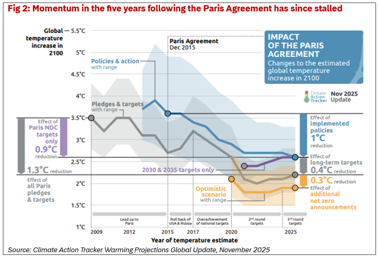Last year also marked the tenth anniversary of the Paris Agreement and the latest Climate Action Tracker, published in November, provided a sobering progress update. It found that there has been little or no measurable improvement over the last four years to the estimated global temperature increase by the end of the century (figure 2). Few countries have updated their 2030 targets and those proposed by China and the EU would not materially change their emissions path, while the US has withdrawn from the Paris Agreement and continues to roll back its climate policies.