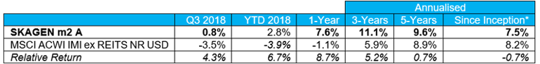 Strong performance from Swedish holdings drives solid absolute and relative gains. SKAGEN m2 A added 0.8% during the quarter, outperforming its benchmark index which fell 3.5%.
