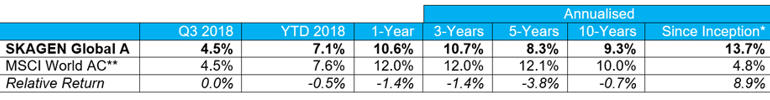 Developed market strength drives solid absolute performance as fund makes new US investments. SKAGEN Global A increased 4.5% in the quarter, in line with the MSCI All Country World Index which also added 4.5%.