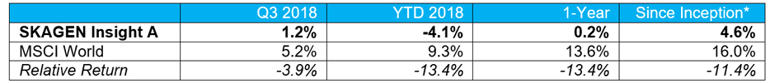 Risk-off sentiment drives relative weakness despite positive corporate transformation within the portfolio. SKAGEN Insight A increased 1.2% during the quarter, underperforming the MSCI World Index which was up 5.2%.
