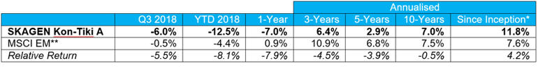 Relative weakness as macro headwinds continue to weigh on EM performance. SKAGEN Kon-Tiki A fell 6.0% during the quarter, underperforming the MSCI Emerging Markets Index which dropped 0.5%.