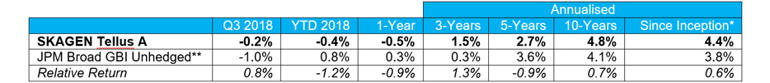 EM uncertainty impacts absolute return as Trump tariffs and Italy concerns weigh on global bond markets. SKAGEN Tellus A fell 0.2% in the quarter, outperforming the JPM Broad GBI Unhedged index which dropped 1.0%.