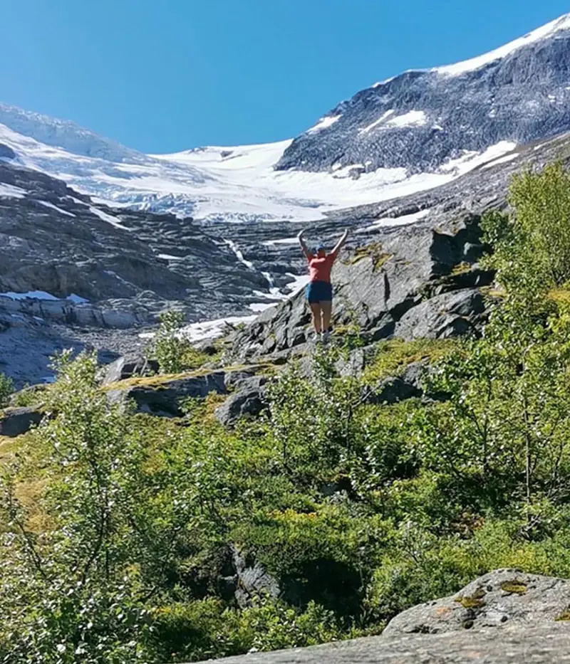 Reidun er ikke ukjent med å gå mye og langt. I 2015 gikk hun Norge på langs, og vinnerbildet ble tatt ved Bødalsseter i Sogn og Fjordane. I bakgrunnen av bildet ser vi Bødalsbreen, en brearm av Jostedalsbreen.