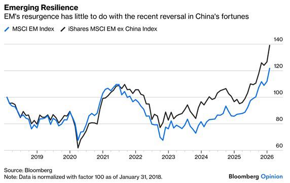 Also notable is the continued strength of emerging markets, which outperformed developed ones significantly in January. The MSCI EM Index is now trading at a record high, surpassing its previous post-Covid peaks with returns broadening beyond China –historically the engine of EM performance (see chart below) – to markets like Korea and Taiwan. SKAGEN Kon-Tiki’s outperformance also continued in January as the fund gained 9.0% in EUR (5.5% in NOK) – you can read more about its successful 2025 trading activity in these countries in a recent Bloomberg interview.