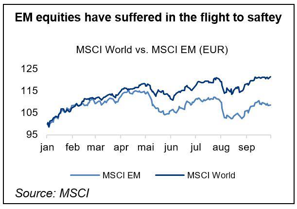 The divergence in performance between developed and emerging market equities that began in April became increasingly pronounced through the third quarter (see chart below) as investor capital has flowed from assets perceived as higher risk to those offering safer havens, as happened at the same point last year. Wide ranging monetary and fiscal policy measures from developing world governments provides greater optimism for EM companies and shareholders this time round, however, particularly with the MSCI EM index trading at an attractive 30% to 40% discount to the MSCI World equivalent based on earnings and book value multiples[1].